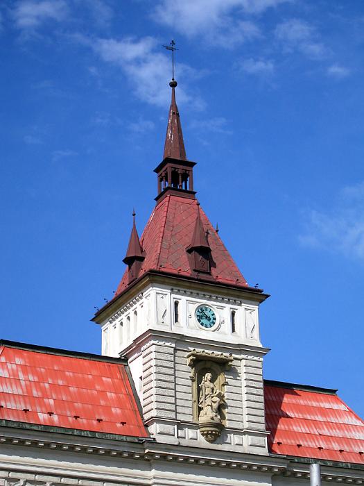 Spire of a small Catholic church.